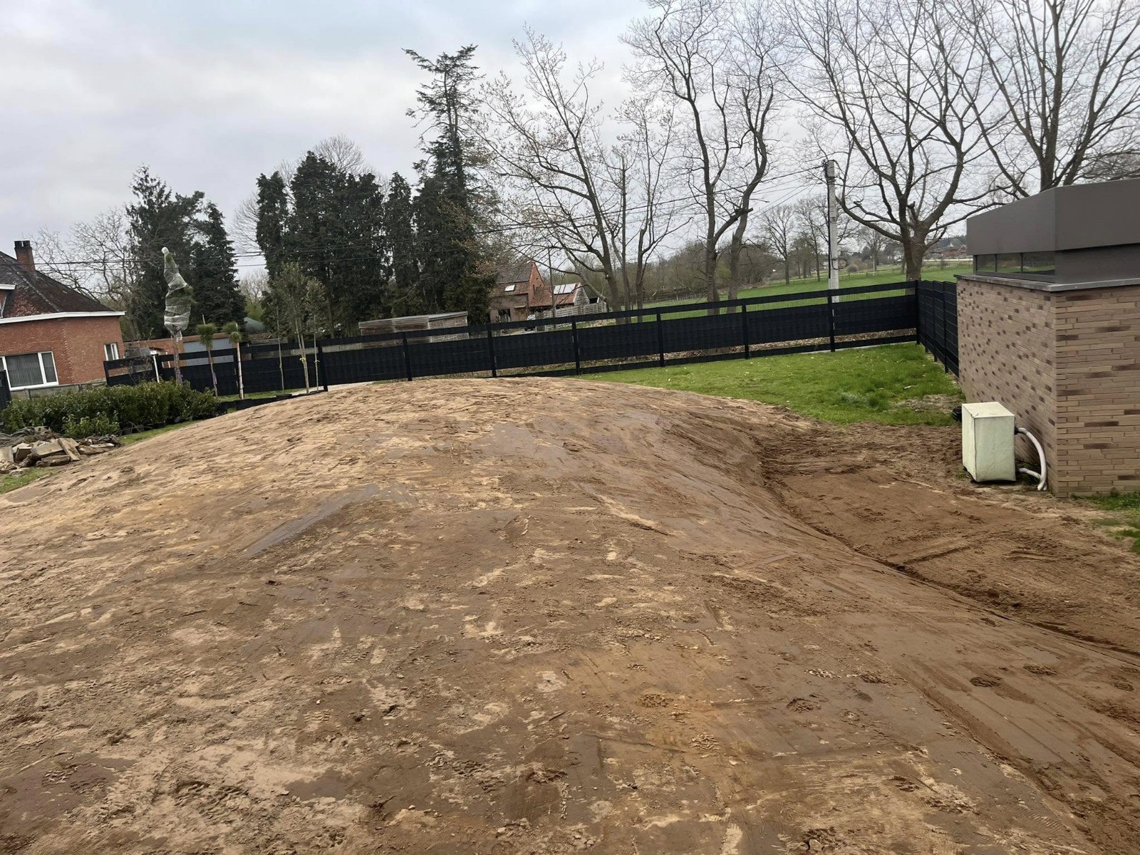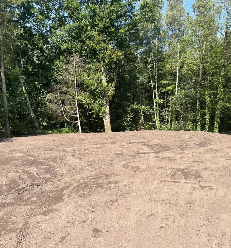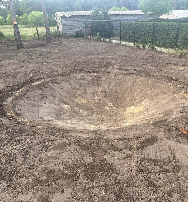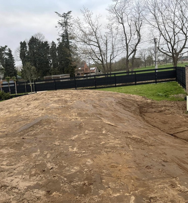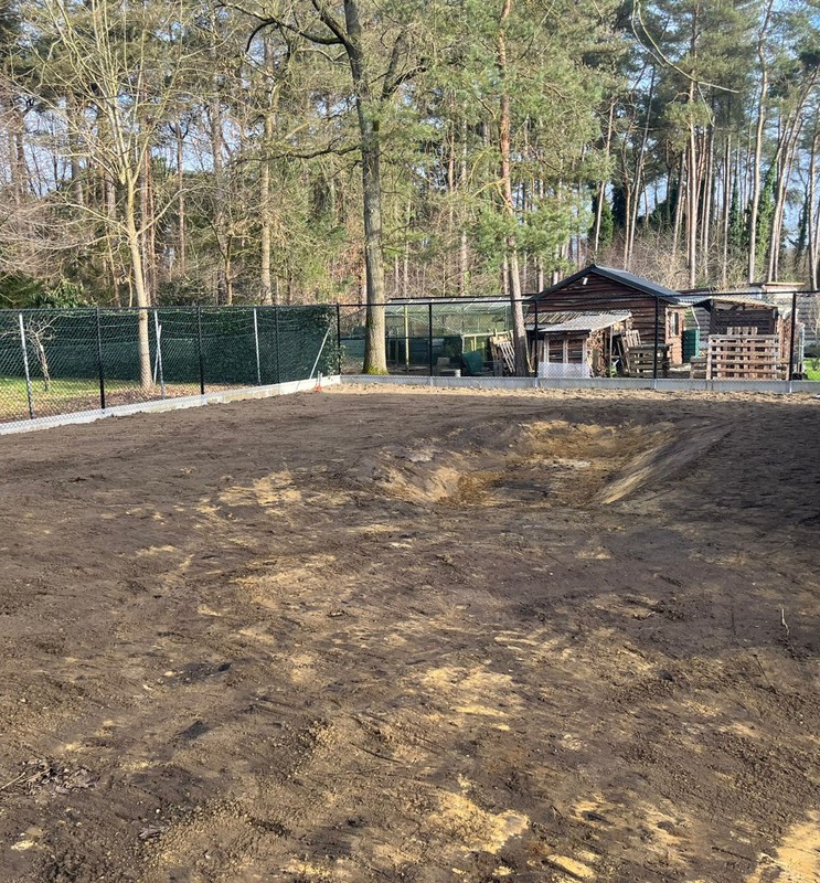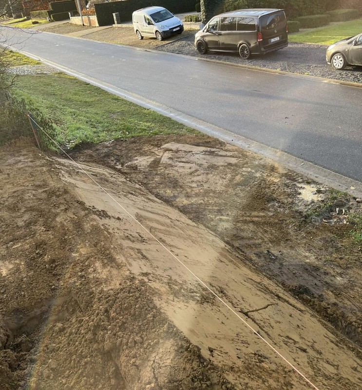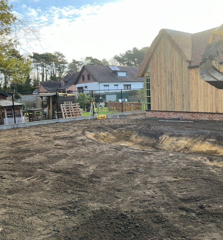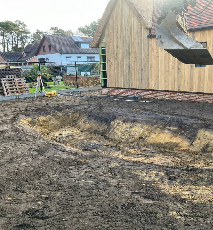 We stemmen het bergingsvolume af op uw dak- en verhardingsoppervlakken en koppelen desgewenst met regenput of riolering. Afwerking gebeurt met geschikte teelaarde, gras/kruidenmengsel en erosiebescherming aan taluds — technisch correct én esthetisch strak.