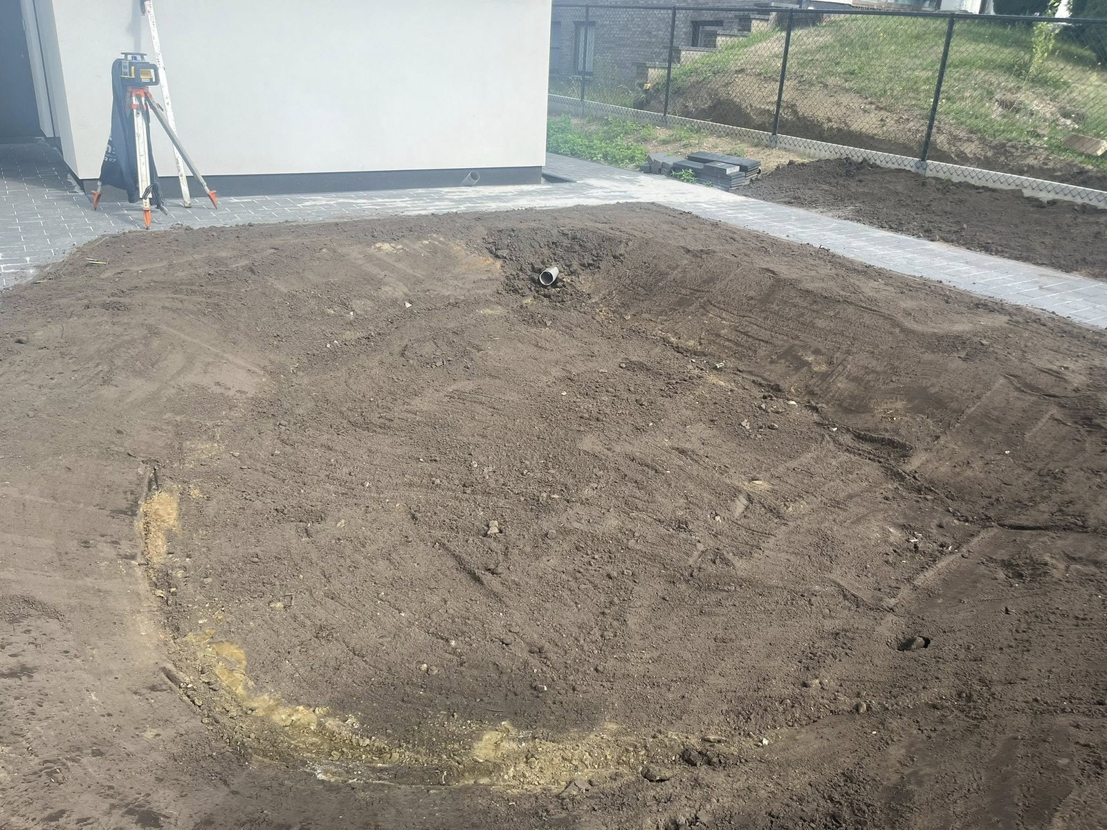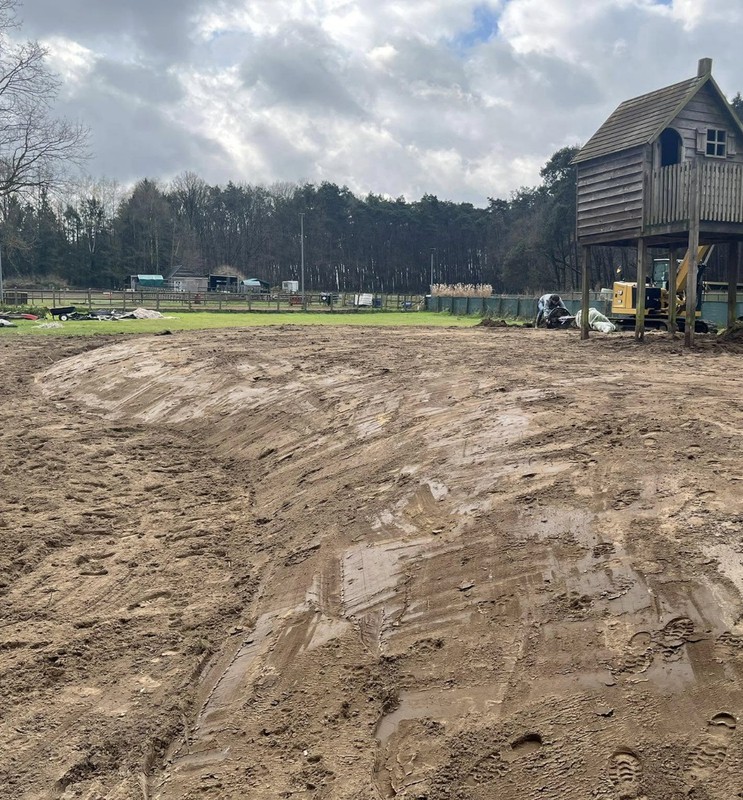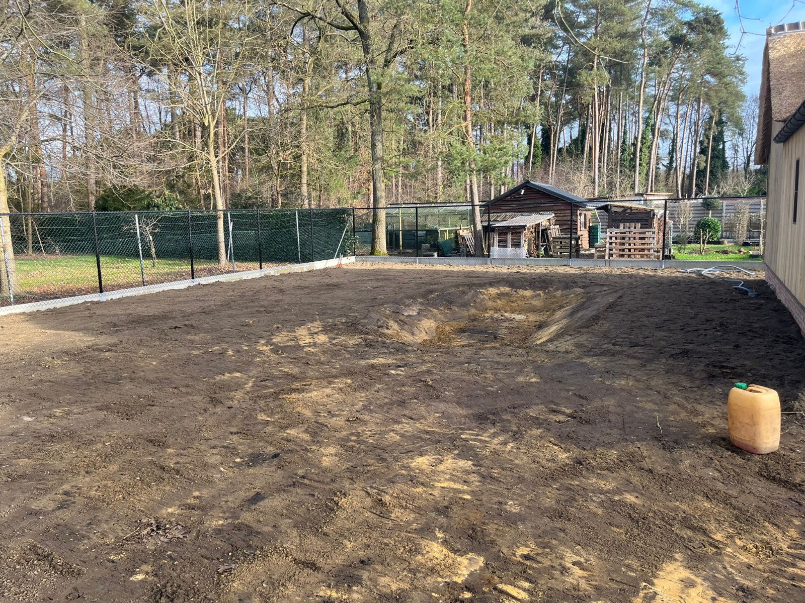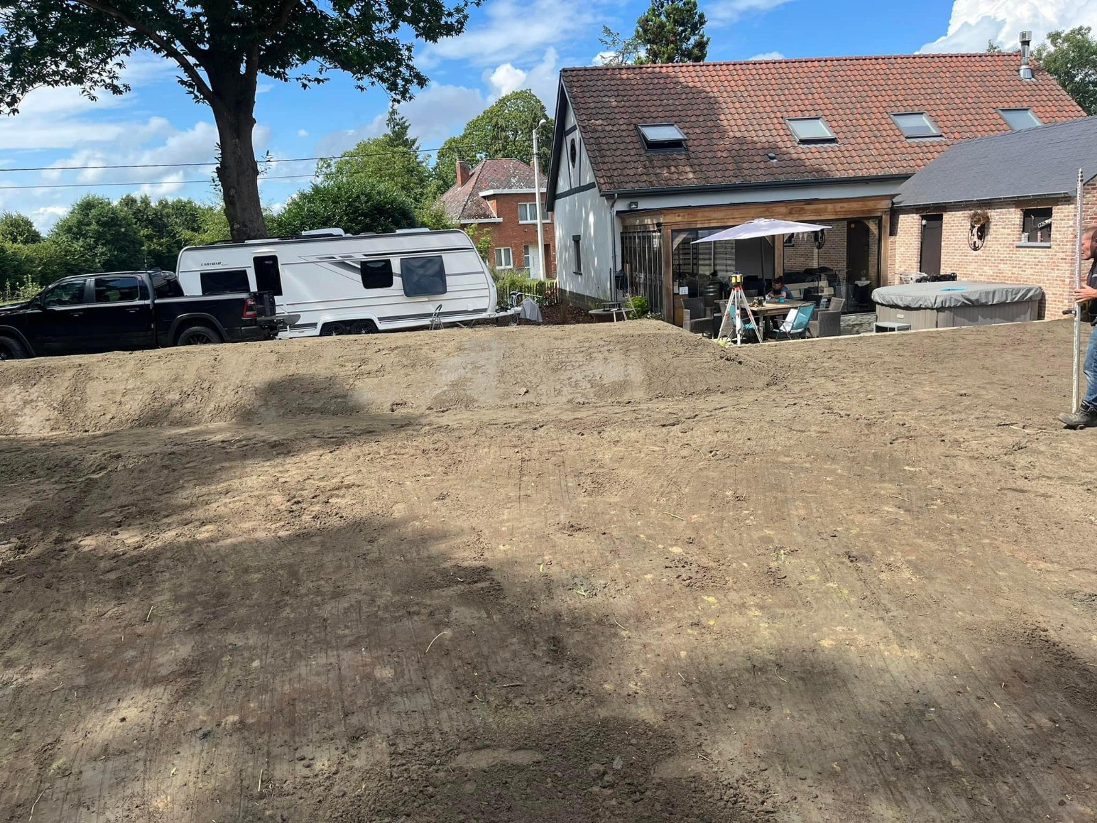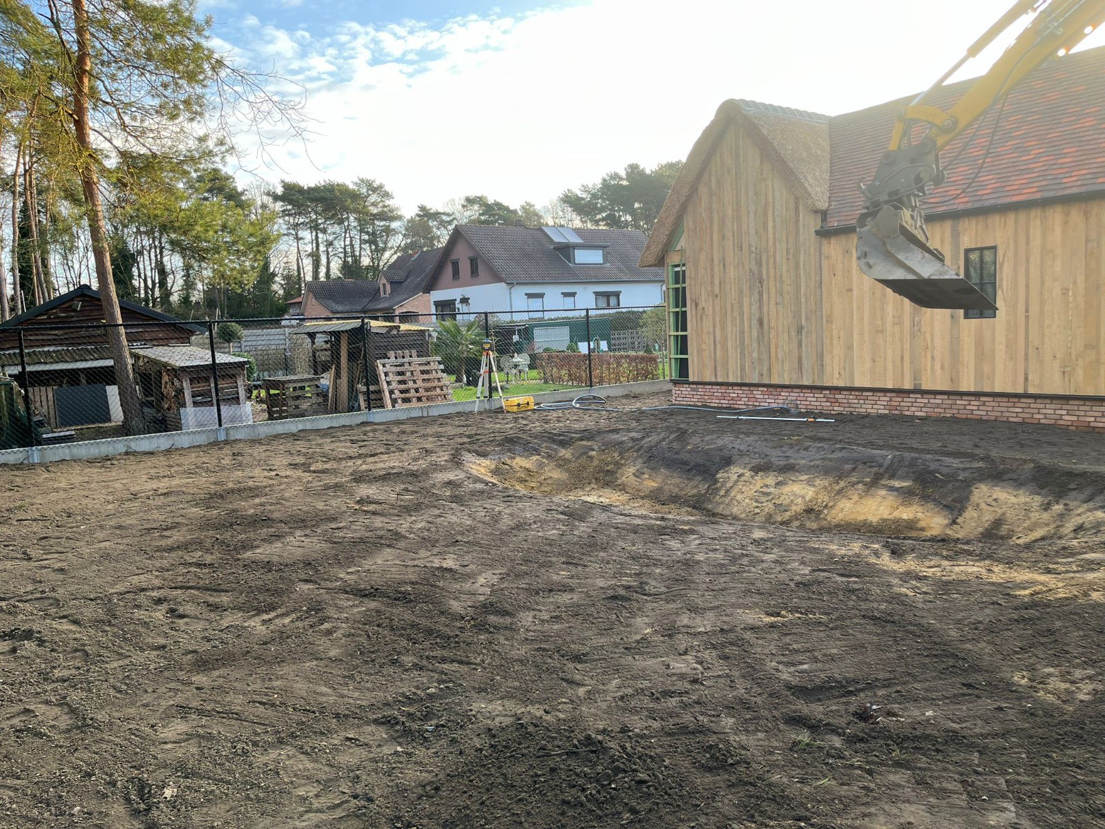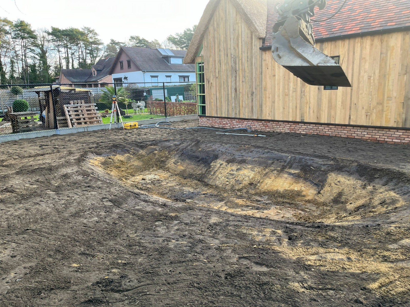 We stemmen het bergingsvolume af op uw dak- en verhardingsoppervlakken en koppelen desgewenst met regenput of riolering. Afwerking gebeurt met geschikte teelaarde, gras/kruidenmengsel en erosiebescherming aan taluds — technisch correct én esthetisch strak.